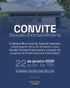 A Câmara Municipal de Tupandi convida todos os cidadãos para participar da Sessão Extraordinária que ocorrerá nesta quarta-feira, 22 de janeiro de 2025, a partir das 19h, no Plenário Heitor José Müller. A sessão terá a apreciação e votação de importantes projetos do Poder Executivo Municipal.