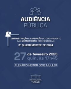 A Câmara de Vereadores de Tupandi, em atenção ao cumprimento do Art. 9°, inciso 4º da Lei Complementar n° 101/2000 (Lei de Responsabilidade Fiscal), convida toda a comunidade para participar da Audiência Pública sobre a demonstração e avaliação do cumprimento das metas fiscais referentes ao 3º Quadrimestre de 2024.